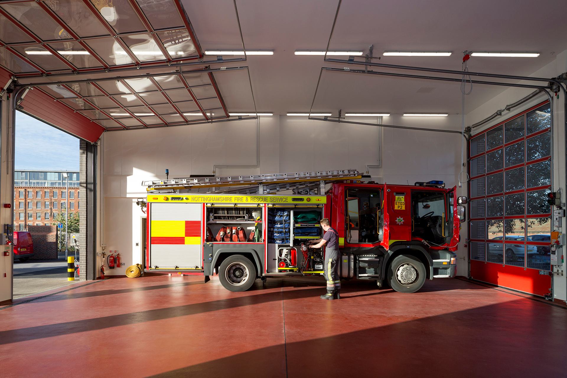 The building accommodates three fire engines plus all necessary support facilities including office space and the main emergency control facility for Nottingham. Sustainable features that were incorporated in the building include solar panels on the roof and a connection to the district heating system - together these features exceed the local authority requirement for 10% of the building’s energy demand to come from renewable sources.