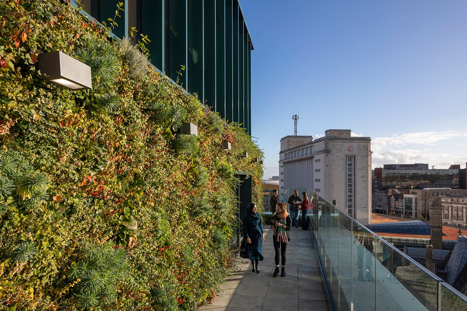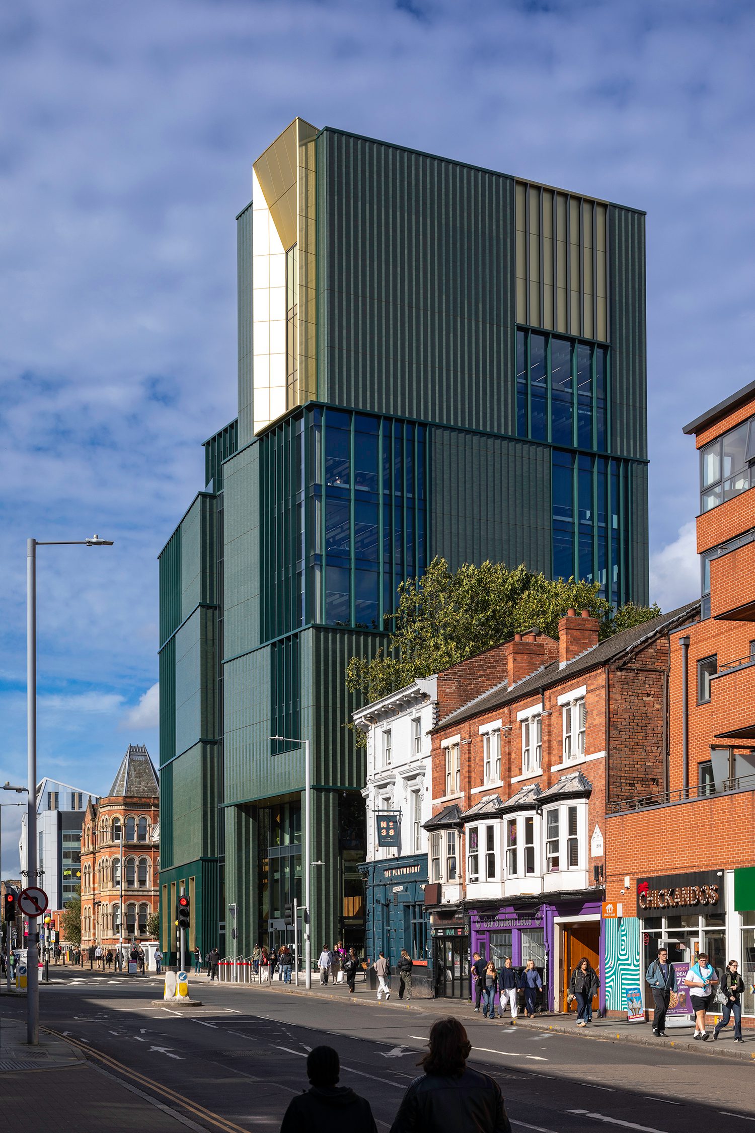Strategically located at the intersection of Shakespeare Street, North Sherwood Street, and South Sherwood Street, DaDA forms a prominent city-centre landmark. Its high-quality design complements surrounding historic structures, including the Arkwright Building (Grade II*), Central Fire Station (Grade II), and University Hall (Grade II). The building’s glazed facades, combined with modern brick and metal accents, create a visually engaging gateway that balances heritage and innovation.