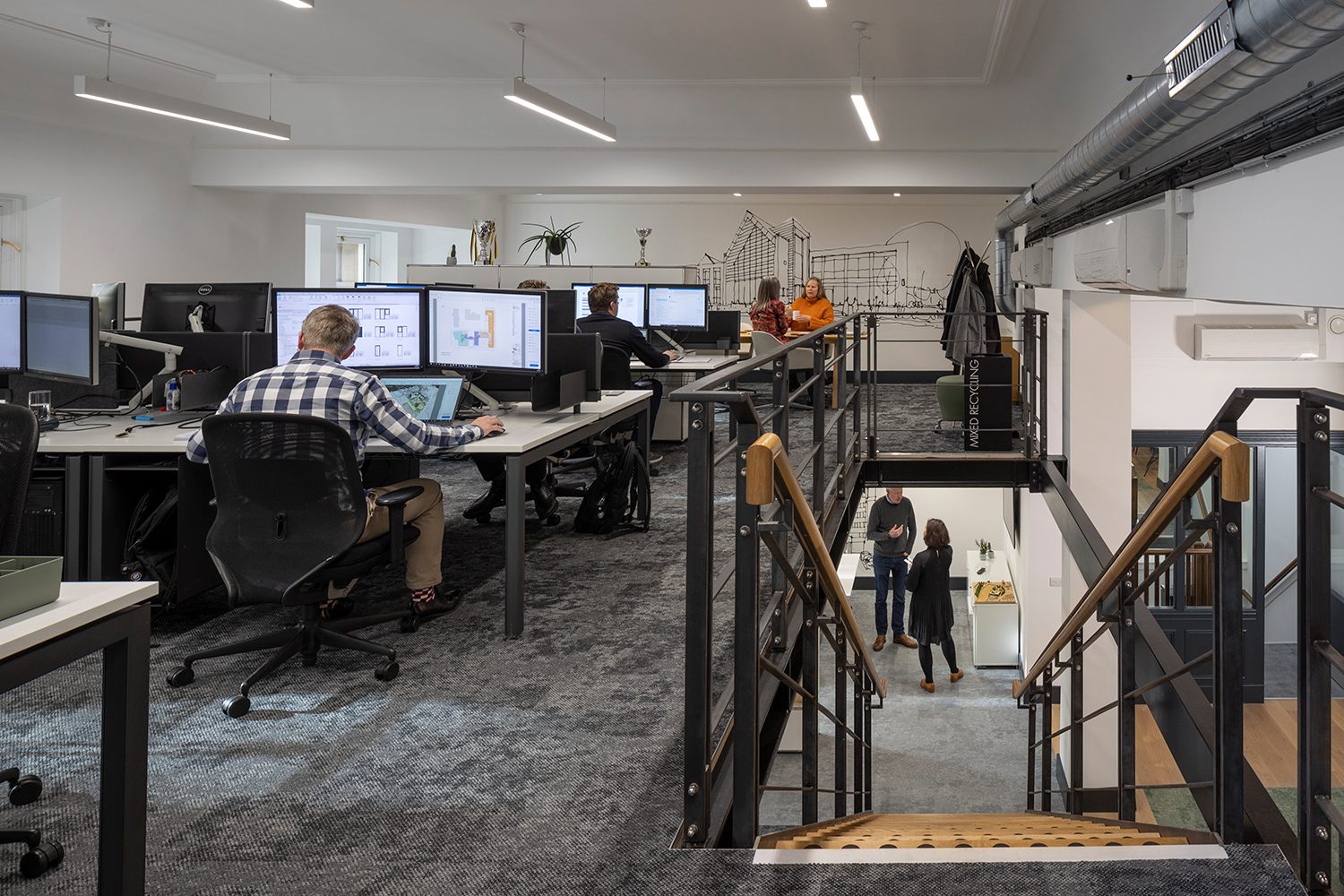 With its front door situated on Bank Place, CPMG’s new studio occupies a building that was formerly a banking HQ and then a restaurant before lying vacant for three years until we took it on. It’s high ceilings, generous glazing and large volume permitted the introduction of a mezzanine where the design studio, associated project storage, personal storage toolboxes and informal meeting space is located.