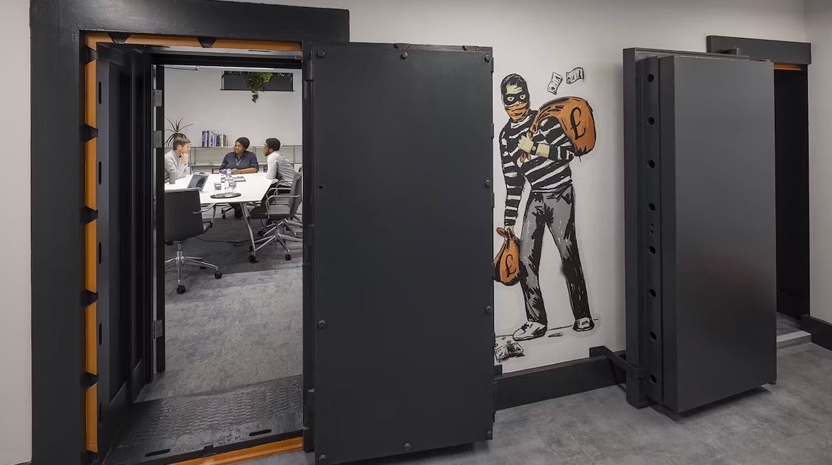 The former bank vaults in the semi-basement, retain their heavy steel doors –a great feature for us to work with. Emerging into our basement break-out space, the robber makes his getaway with his bag of swag!