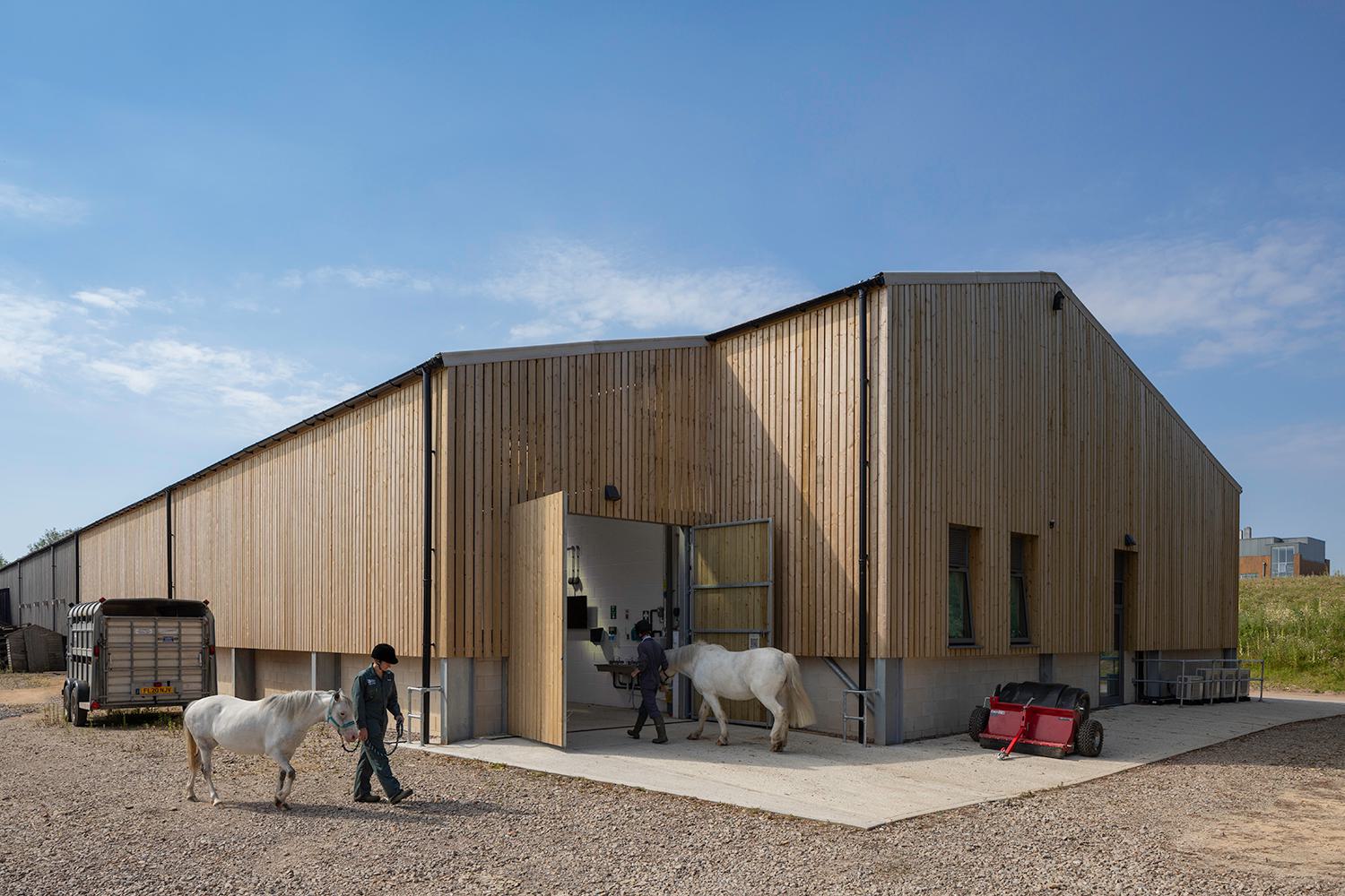 The single-storey veterinary education facility at the University of Nottingham's Sutton Bonington Campus exemplifies an innovative design with a strong emphasis on sustainability. Central to this design is the use of glulam framing, where engineered wood beams have been chosen to significantly reduce embodied carbon. This choice aligns with the university’s net zero carbon strategy, emphasising their commitment to environmental responsibility. The facility's design also prioritises hygiene, incorporating advanced measures to ensure cleanliness and safety in veterinary and animal care activities. This focus on hygiene is critical given the nature of the work conducted within the space. Additionally, the facility is designed with versatility in mind, featuring distinct areas for general teaching, as well as specialised holdings for small animals and larger livestock. This variety supports comprehensive veterinary education, allowing the university to offer a robust curriculum to its students.